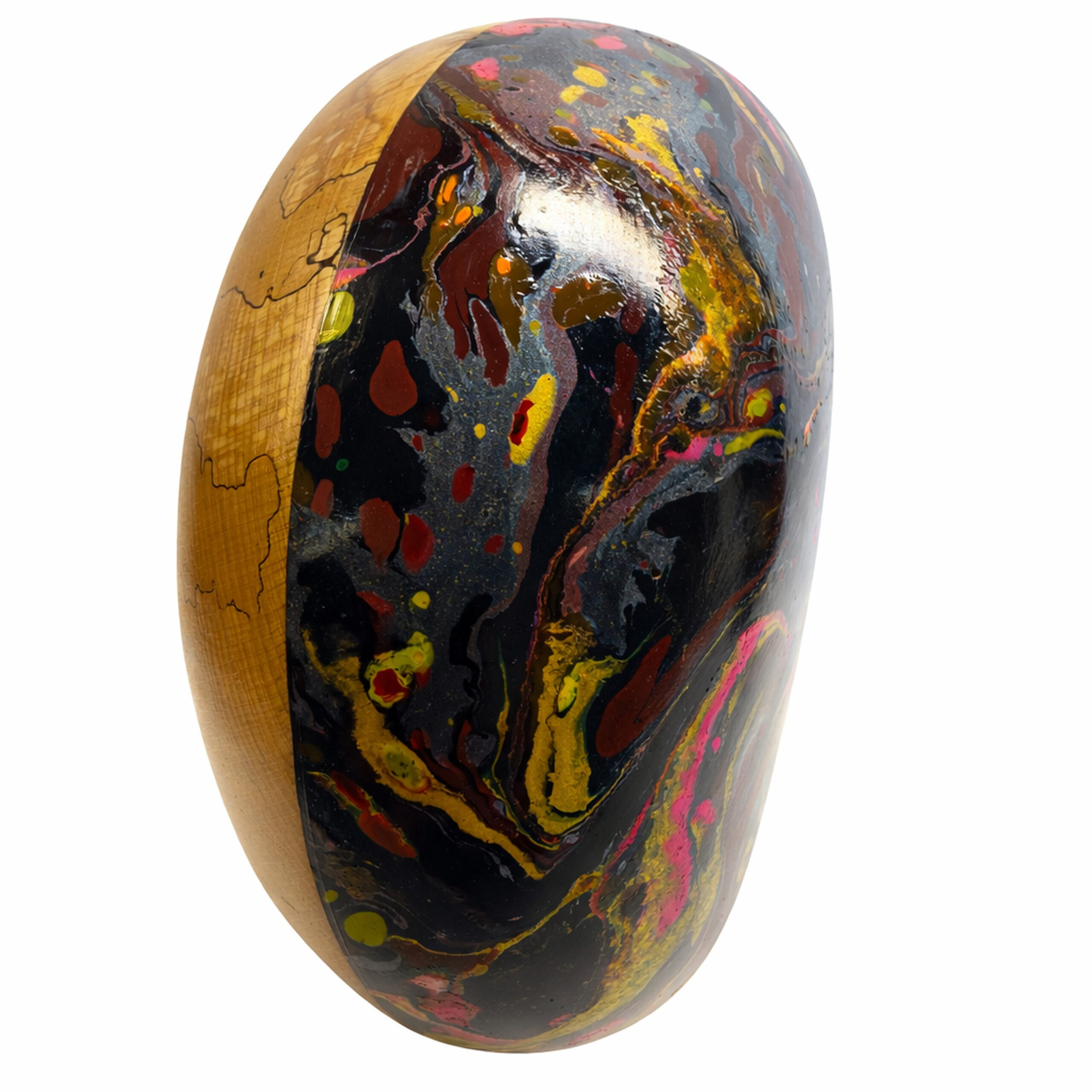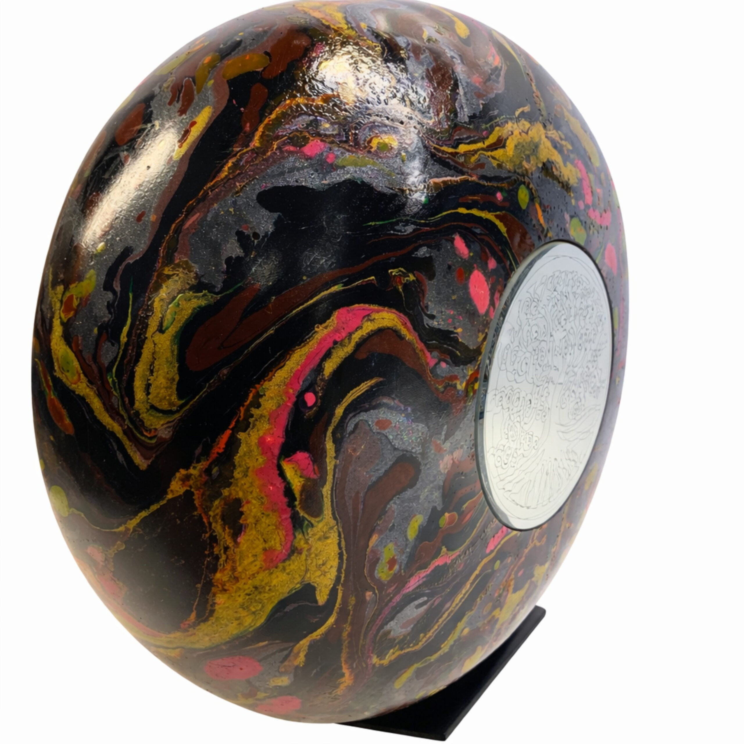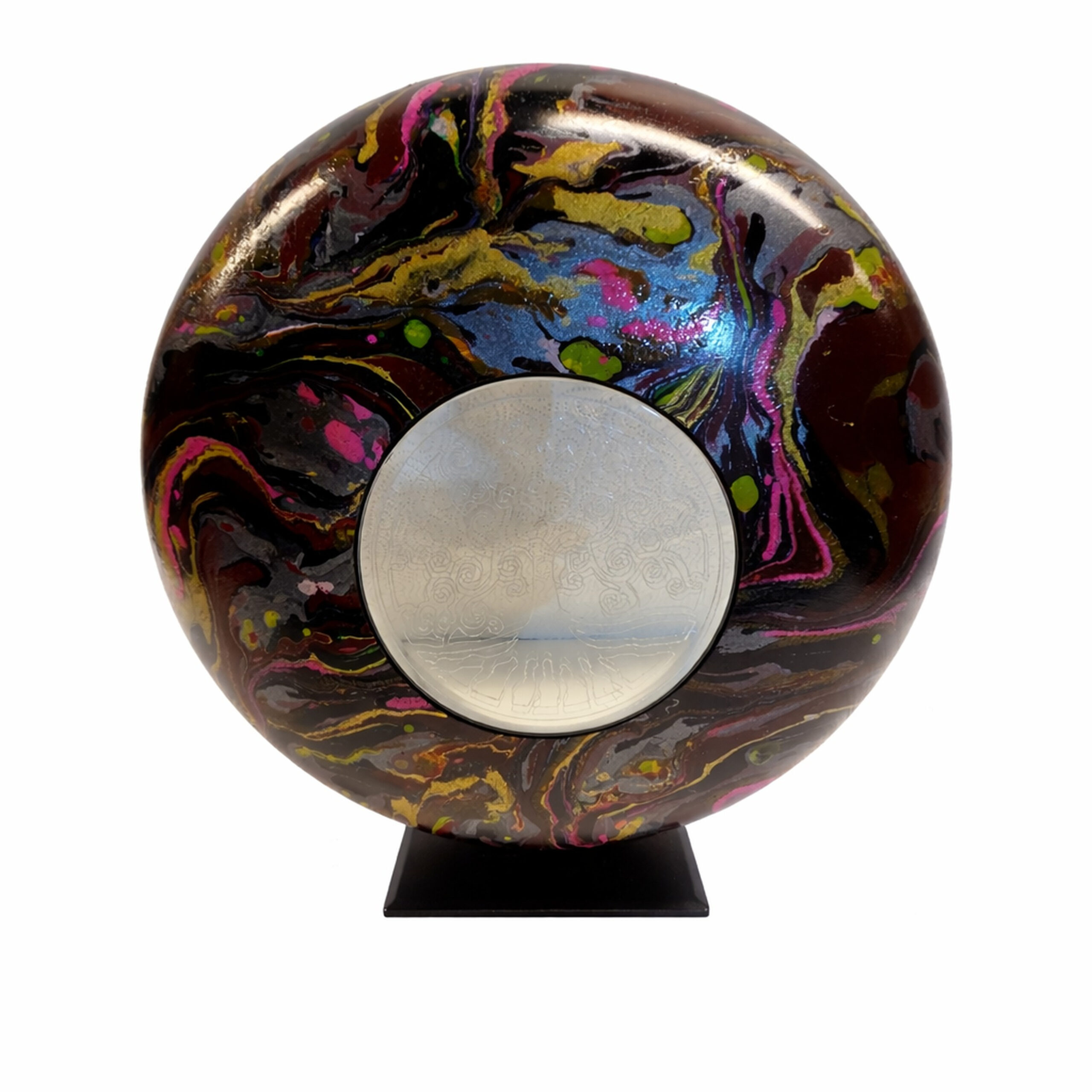 Deze bijzondere urn is een waar kunstwerk, ontstaan uit de samensmelting van natuur en creativiteit. Elke urn wordt met de hand afgewerkt en voorzien van een kleurrijke hydro-dip techniek, waardoor geen twee exemplaren ooit hetzelfde zijn. De vloeiende patronen en diepe kleuren symboliseren beweging, herinnering en de oneindige verbondenheid tussen verleden en heden.
