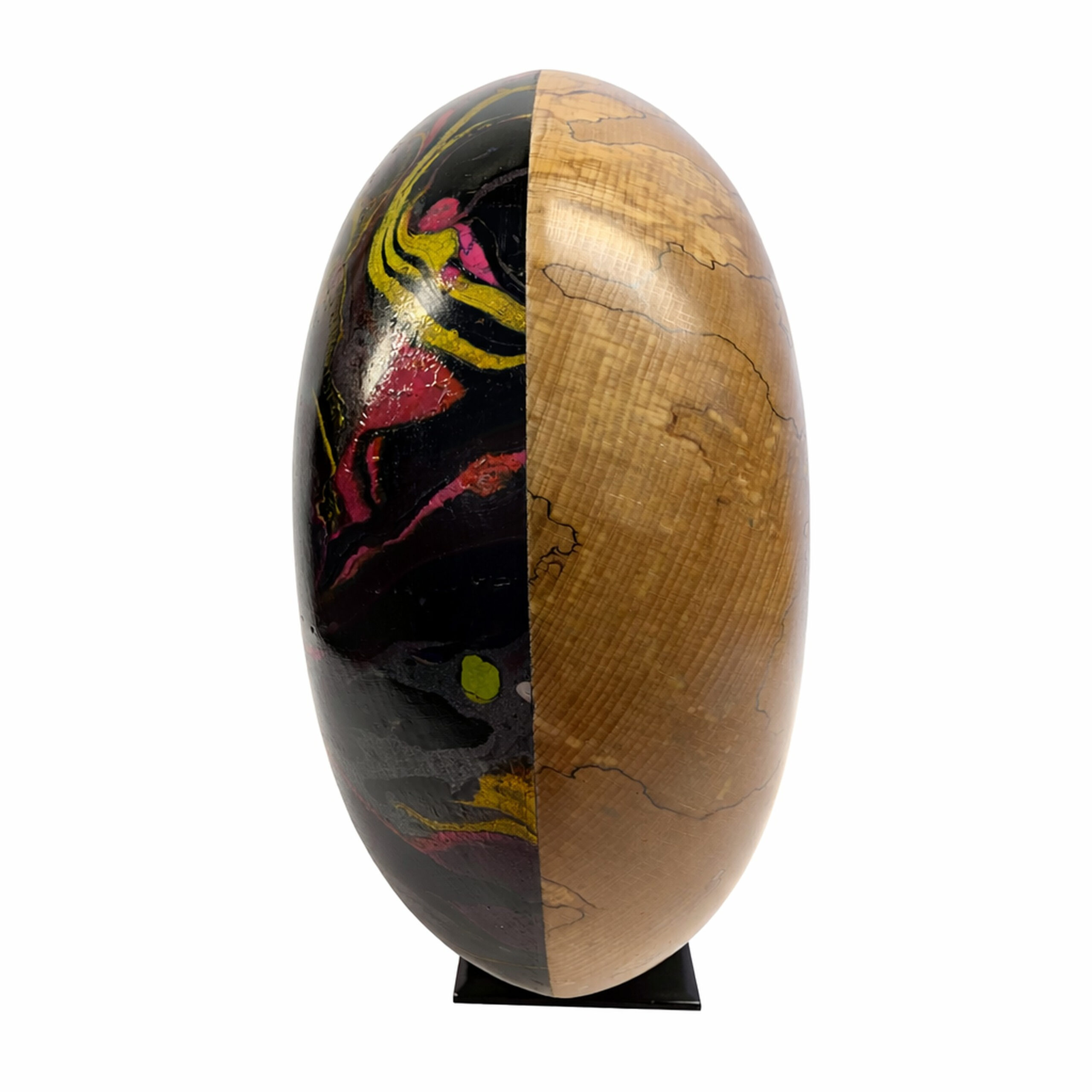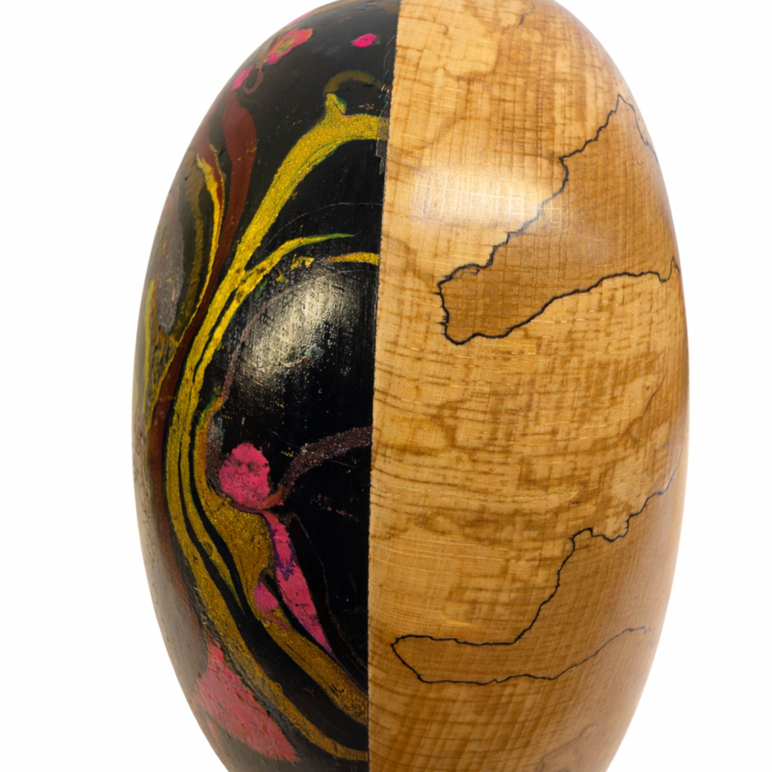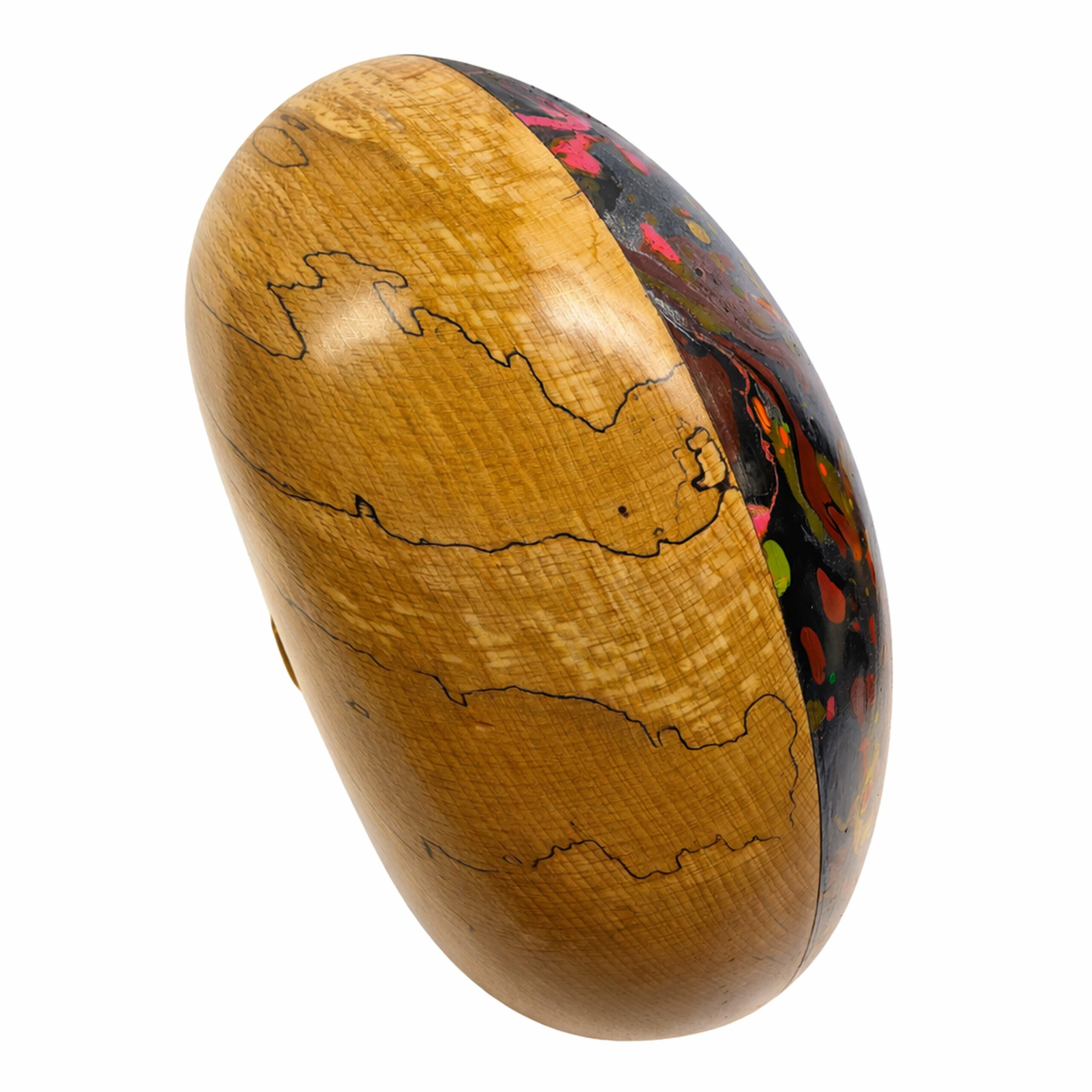 Deze bijzondere urn is een waar kunstwerk, ontstaan uit de samensmelting van natuur en creativiteit. Elke urn wordt met de hand afgewerkt en voorzien van een kleurrijke hydro-dip techniek, waardoor geen twee exemplaren ooit hetzelfde zijn. De vloeiende patronen en diepe kleuren symboliseren beweging, herinnering en de oneindige verbondenheid tussen verleden en heden.
